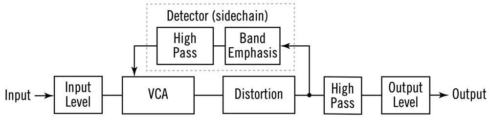 Схема компрессора не имеет выходного трансформатора, что позволяет уменьшить уровень интермодуляционных искажений. Иными словами, использование дисторшна не даёт неприятных артефактов.