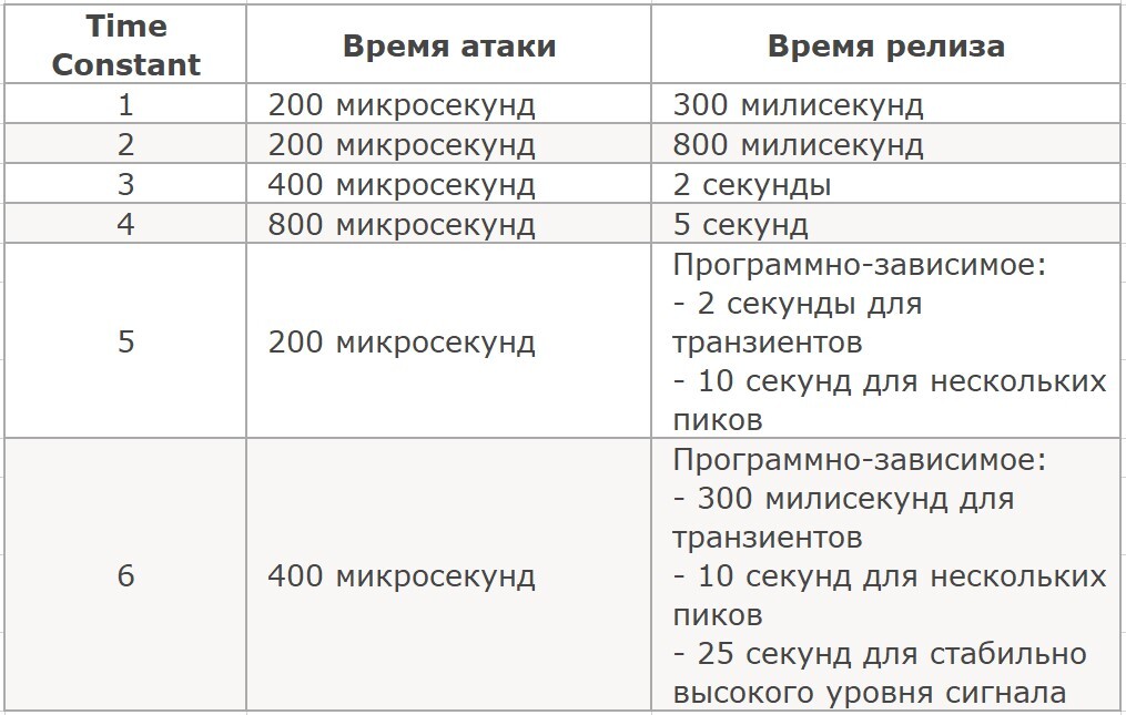 Time Constant - 6-позиционный переключатель фиксированных значений атаки и релиза. Положения 1-4 - медленная компрессия, 5-6 - авто релиз.