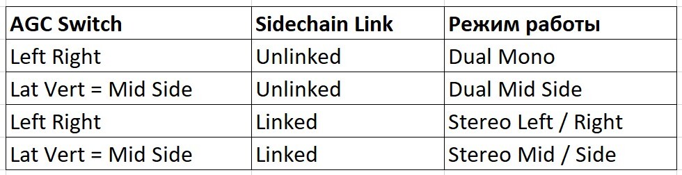 В зависимости от положения переключателя AGС а также переключателя Sidechain мы получаем 4 режима работы прибора.