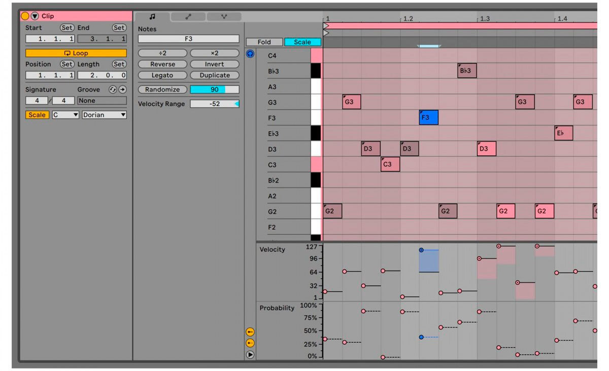 - Инструменты для добавления случайности: функции вероятности проигрывания нот и вероятности скорости нажатия позволяют определять вероятность звучания нот и значения скорости нажатия, создавая удивительные вариации для ваших паттернов или вариации в их динамике.
