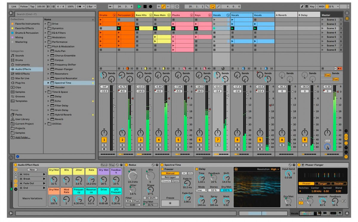 - Новые устройства: растягивайте, сдвигайте и размывайте звуки с помощью Spectral Resonator и Spectral Time. Поместите звуки в любое реальное или нереальное пространство с помощью Hybrid Reverb.