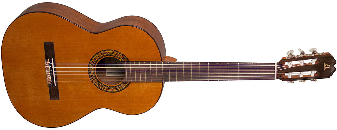 Неплохой вариант классической гитары, одна из самых доступных моделей испанского производства с массивной передней декой. Гитара обладает хорошим, сбалансированным и тёплым звучанием, характер тембра открытый и бархатный. Топ из цельного кедра, задняя дека, гриф и обечайка выполнены из красного дерева, накладка их палисандра. Удобный, "тонкий" гриф. Из недостатков - т.к. гитара все-таки из бюджетной ценовой категории возможны дефекты по части сборки, при выборе желательно провести тщательный осмотр.