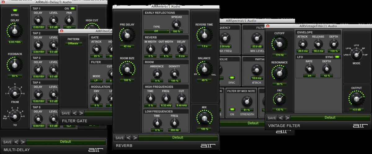 - AIR DiffusorDelay: эффект задержки, синхронизированный с темпом сессии и использующий регулируемый уровень диффузии, что позволяет имитировать рассеивание эха в реверберационном пространстве.