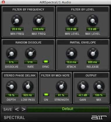 - AIR Spectral: Spectral анализирует входящий сигнал (его частоты, уровень, MIDI-ноты и другую информацию) и определяет, какие частоты будут и не будут частью ресинтезированного выходного сигнала. Настройте входящий сигнал с помощью элементов управления Filter By, а затем поэкспериментируйте со звуком, играя с элементами управления «dissolve», огибающей и стереофазой. Результаты могут вас удивить!