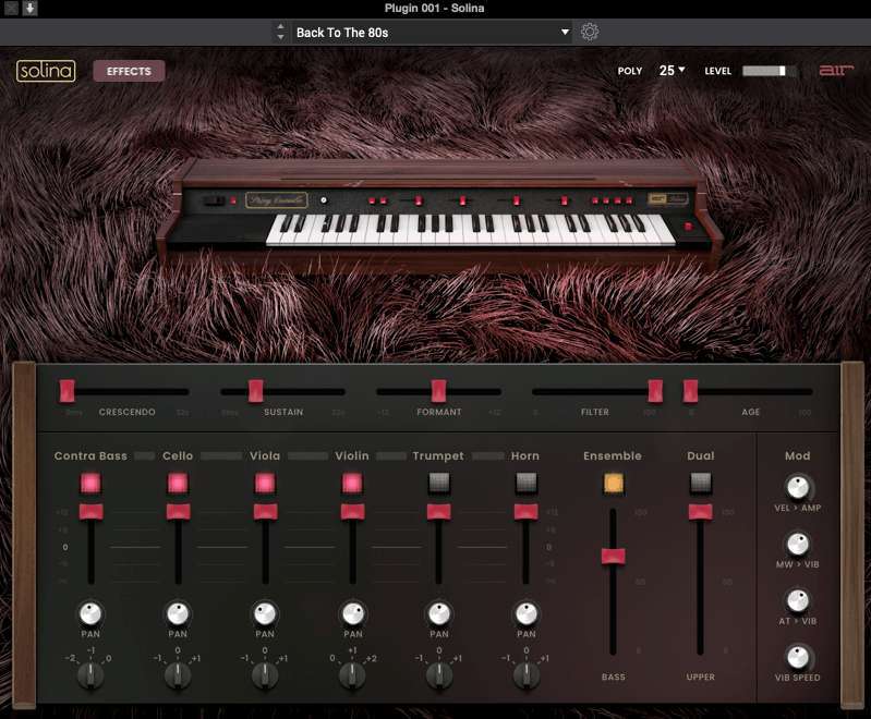 AIR Solina Based on the Iconic classic 6-timbre polyphonic keyboard instrument featuring Contrabass, Cello, Viola, Violin, Trumpet and Horn selections with independent volume, pan and pitch control.