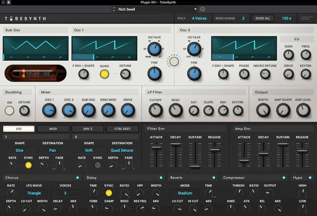 В AIR TubeSynth встроена обработка аудиоэффектов мирового класса, чтобы вы могли быстро улучшать свои звуки в процессе создания. Выбирайте из Chorus, Delay, Reverb, Compressor и нового Hype EQ — для каждого предусмотрен отдельный раздел для точной настройки.