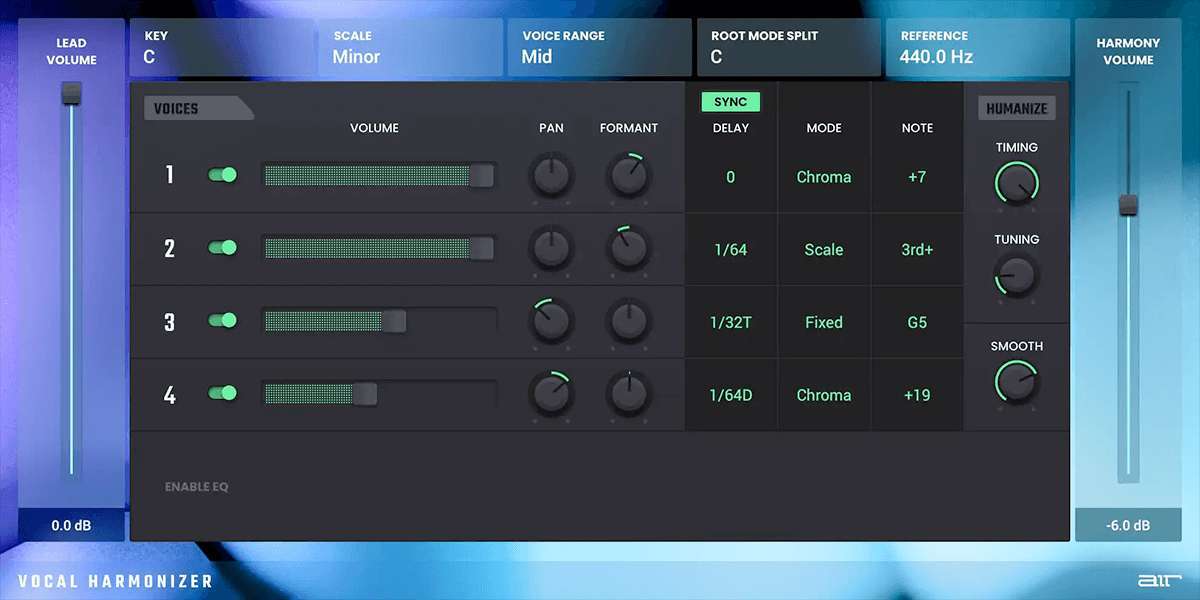 Иногда мелодии нужна гармония, чтобы засиять. AIR Vocal Harmonizer дает возможность мгновенно создавать полные 4-голосные гармонии. Добавьте квинту ниже, большую или малую терцию выше или даже создайте целую секцию бэк-вокала из одной аудиодорожки. Погрузитесь глубже в настройки AIR Harmonizer, регулируя эквалайзер, панораму и другие параметры, чтобы гармоническая секция идеально вписалась в микс. Поскольку дополнительные голоса генерируются AIR Harmonizer, вам не нужно беспокоиться о проблемах с ритмикой или строем, возникающих при наложении вокальных дорожек или работе с несколькими бэк-вокалистами. Используйте AIR Harmonizer для получения профессиональных вокальных результатов, экономя время и завершая свои треки быстрее.