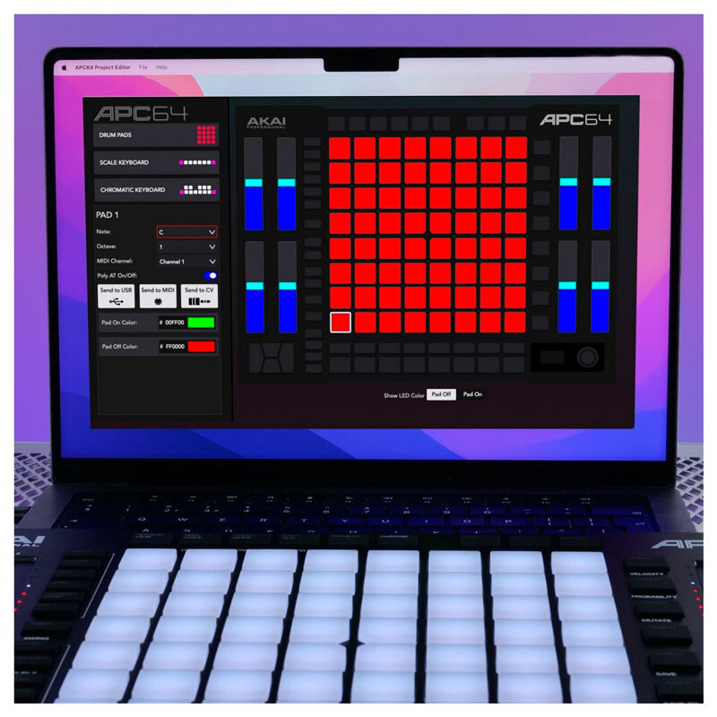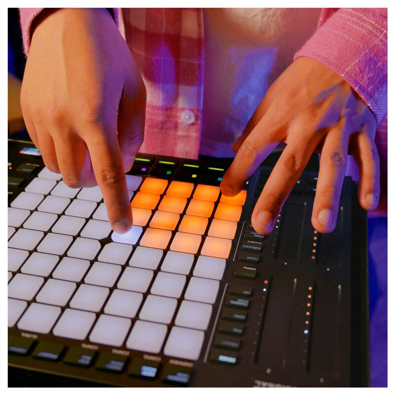 - Матрица 8x8 пэдов для запуска клипов, ввода нот, режима ударных и программирования секвенсора