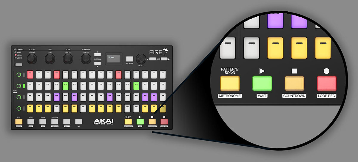 Akai Pro Fire включает в себя 4 банка из 4 адаптивных к нажатию кнопок для полного контроля канала, микшера и других параметров.