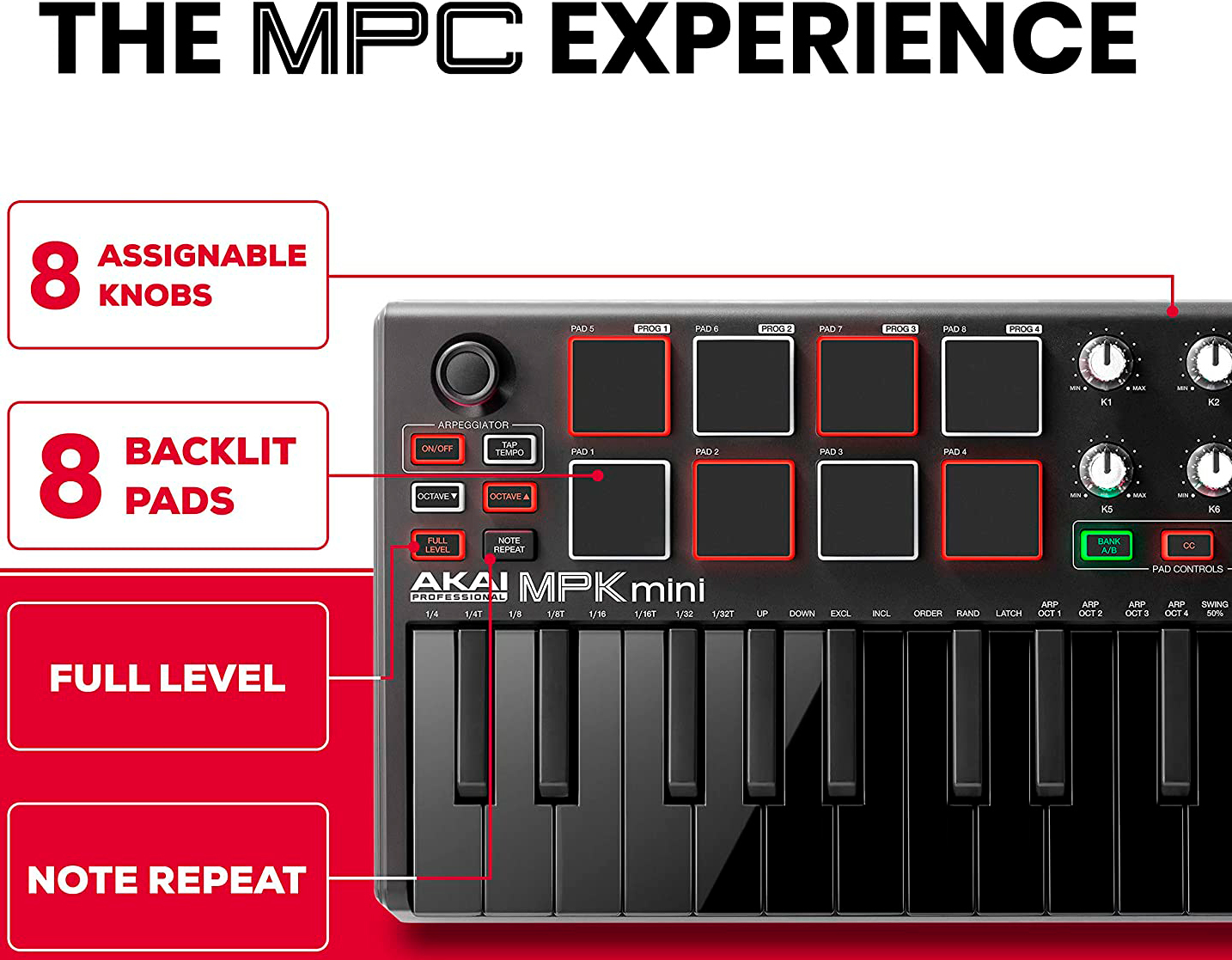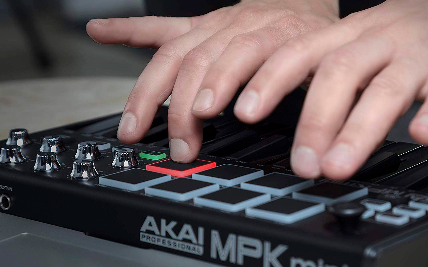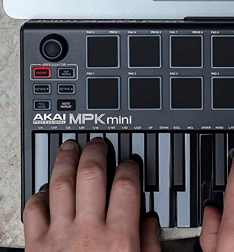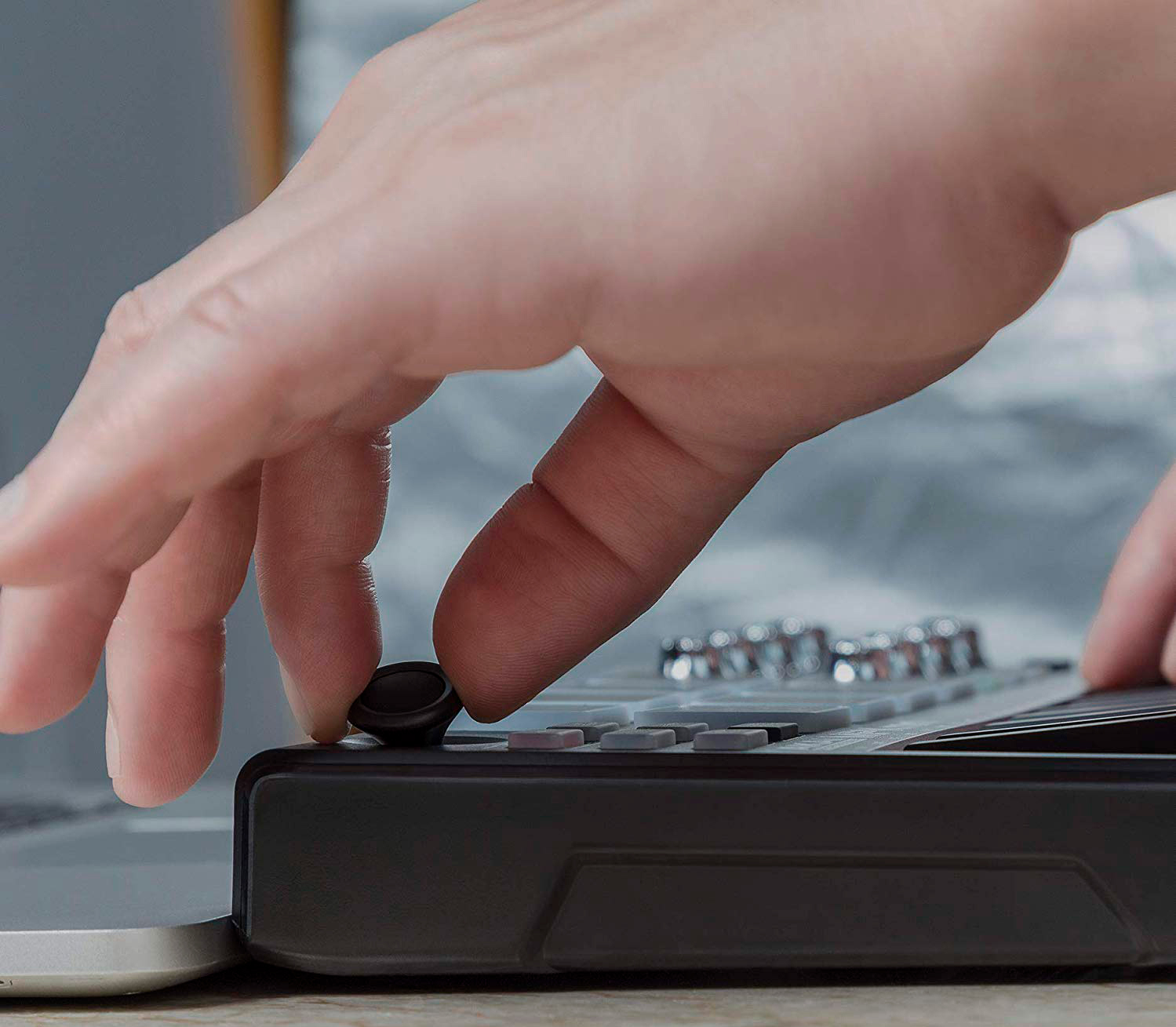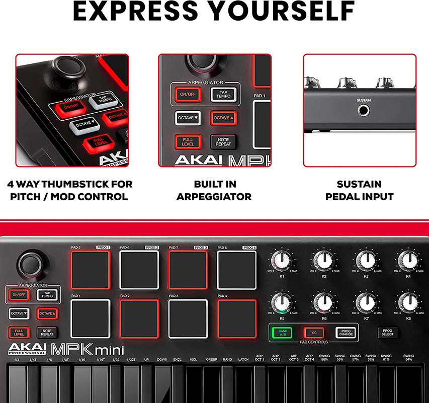 В наличии 8 пэдов с подсветкой для работы с сэмплами. 8 энкодеров предназначены для управления встроенными звуками и параметрами DAW. 4-позиционный джойстик — для регулировки высоты тона и модуляции. Имеется встроенный арпеджиатор с дополнительными настройками.