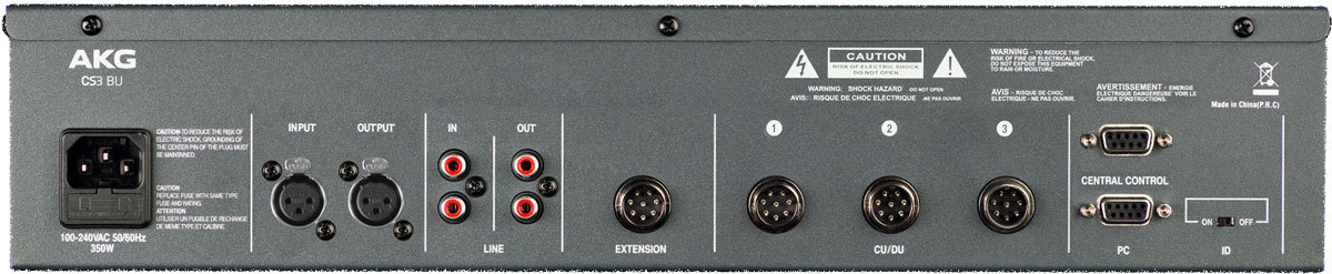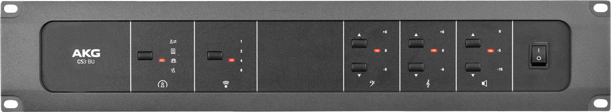 AKG CS3 BU является базовым блоком для конференц-системы CS3 и имеет все необходимые входы и выходы для управления конференцией до 60 микрофонных станций. Функциональные возможности AKG CS3 BU предусматривают интеграцию со всеми аудиоустройствами конференц-зала, а также есть интерфейс RS232 для подключения дополнительной системы управления камерой. CS3 BU может работать автономно в четырех выбираемых режимах, предлагая максимальную гибкость в управлении конференциями. С функцией ограничения NOM максимальное количество активных станций может быть запрограммировано на 1, 2, 4 или 6 одновременно открытых микрофонов.