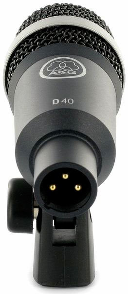 AKG D40 микрофон для духовых, барабанов, перкуссии и гитарных комбо динамический кардиоидный, разъём XLR, частотный диапазон 75-17000Гц, чувствительность 2,2мВ/Па, импеданс 200Ом, рекомендованная нагрузка 2000Ом, в комплекте чехол и адаптер H440, цвет тёмный.