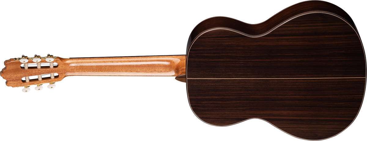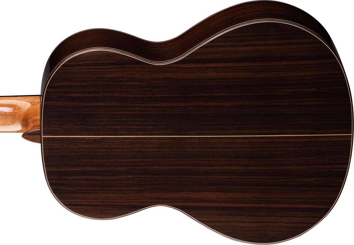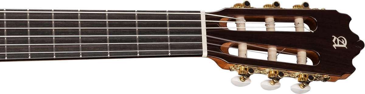 Четыре слоя легкого лака подчеркивают текстуру верхней деки изготовленной из западного красного кедра (туи складчатой) и великолепный ламинат палисандра задней деки и обечайки. Накладка грифа из замечательного черного дерева.