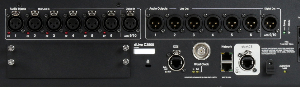 Цифровая система серии dLive C Class включает в себя управляющую консоль, к которой можно опционально добавлять системные рэки (стейджбоксы) и карты расширения для подключения аналоговых входов и выходов. На задней панели пульта расположены только основные входы (6 х XLR,1 x AES) и выходы (6 х XLR, 1x AES), увеличить количество каналов можно за счет модулей расширения. В целом пульт может принимать до 300 каналов через разъемы giga ACE/DX32 и до 128-ми по слоту i/O.