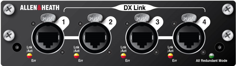 Allen & Heath dLive-M-DL-DXLINK-A - звуковая сетевая карта для систем dLive. Карта является одним из нескольких вариантов аудиосети, которые могут быть установлены на любом порту ввода/вывода Allen & Heath dLive. Карта обеспечивает 4 порта DX Link, каждый из которых оснащен 32 × 32 каналами с частотой 96 кГц, которые могут использоваться для подключения к модулям расширения dLive DX в параллельном режиме или режиме резервирования.
