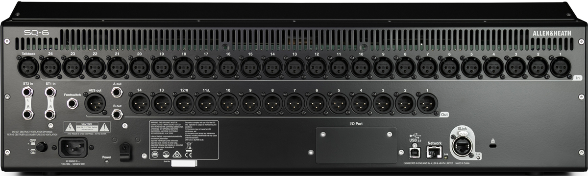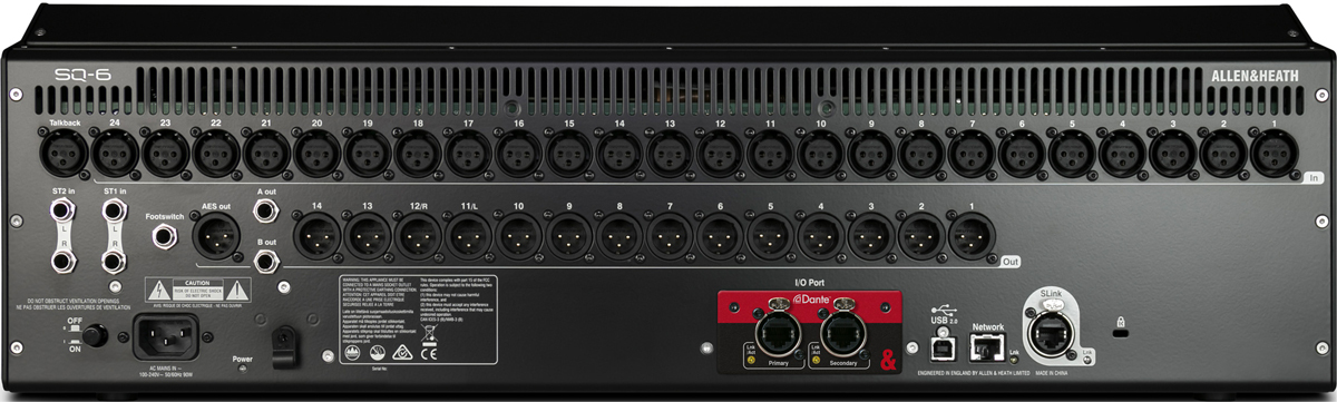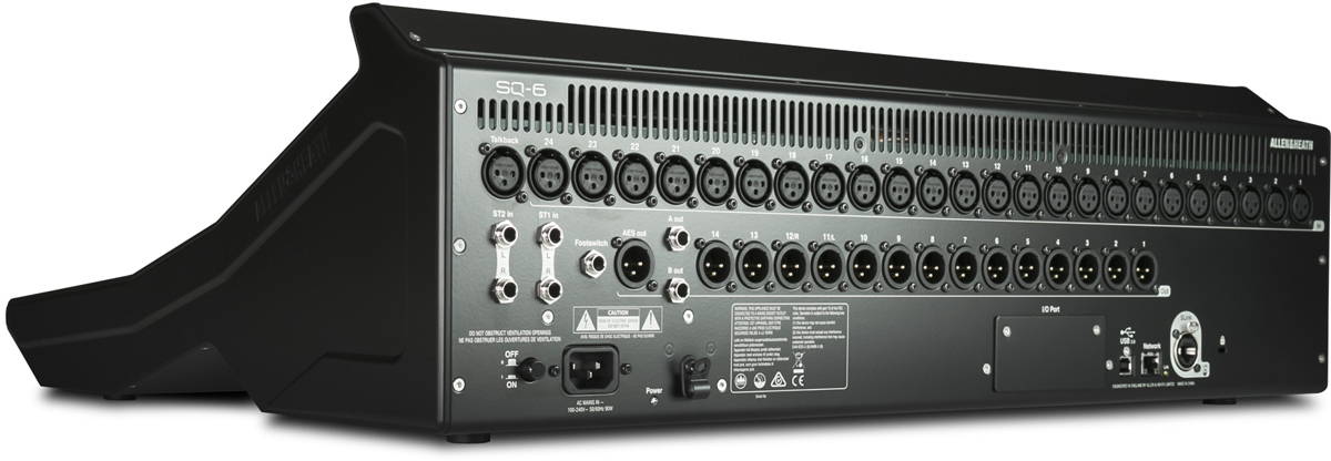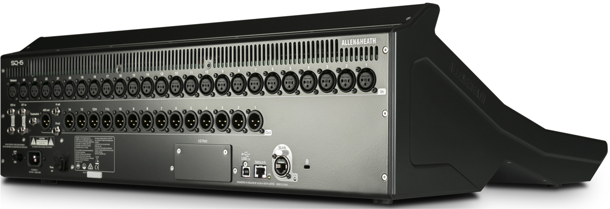 SQ-6 имеет 24 входных канала с предусилителями и 25 фейдеров. Количество доступных входов может быть увеличено до 48 за счет внешних модулей расширения. SQ-6 имеет слот для установки интерфейсных карт Dante, Waves и др., которые увеличивают возможности интеграции, позволяют реализовать сплитирование входов для FoH и мониторных пультов, а также выполнять многоканальную запись.