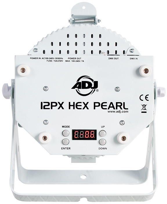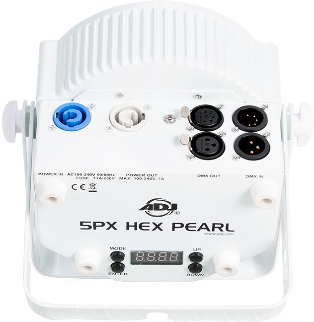 5PX Hex Pearl от ADJ – это многофункциональный светодиодный прожектор с 5 светодиодами HEX 6-в-1 мощностью 12 Вт каждый. Благодаря углу луча 30˚ пользователи могут создавать широкое омывающее освещение с плавным смешиванием цветов с помощью 63 встроенных цветовых макросов на основе красных, зеленых, синих, янтарных, белых и ультрафиолетовых светодиодов. Этот светодиодный прожектор отлично подходит не только для освещения сцен, но и – благодаря интеллектуальным разъемам питания и DMX (подана заявка на патент) – для подсветки мест проведения мероприятий.