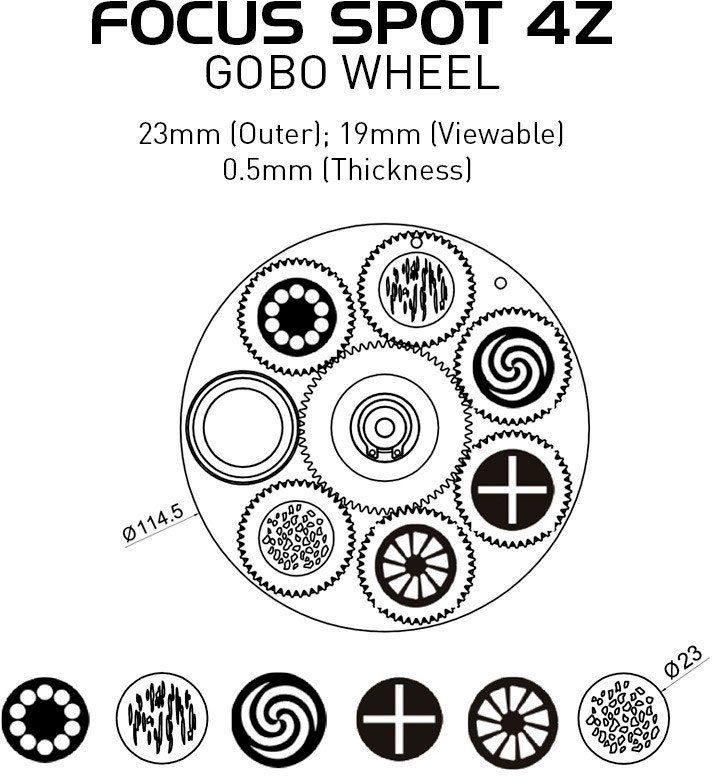 - Размер гобо: 23 мм (наружный); 19 мм (видимый размер); 0,5 мм (толщина)