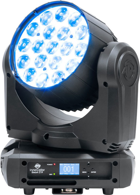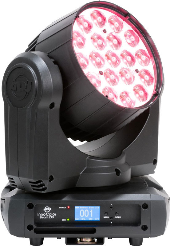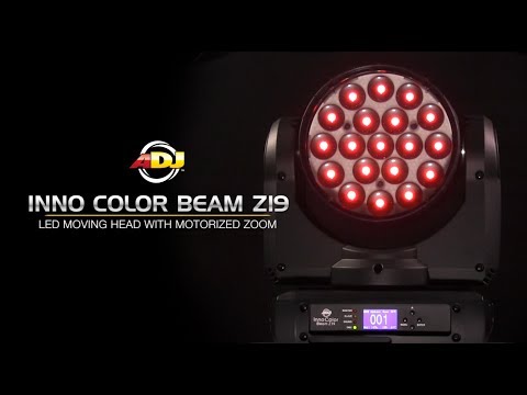 ADJ Inno Color Beam Z19 прожектор полного движения мощностью 190 Вт с моторизованным зумом. 19 светодиодов RGBW Quad Color (4-в-1) Osram мощностью 10 Вт. Моторизованный зум: угол луча 10-60°. 14 DMX-каналов, 64 встроенных цветовых макроса.