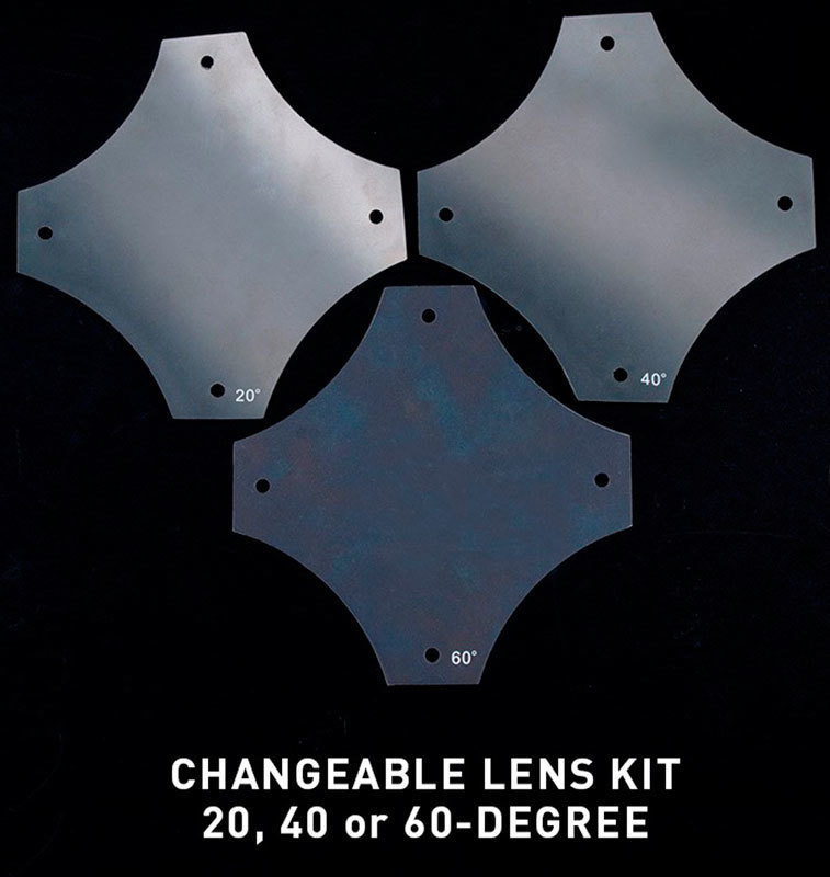 - Комплект поставки включает 3 фильтра размытия для изменения угла луча: 20°, 40° и 60°