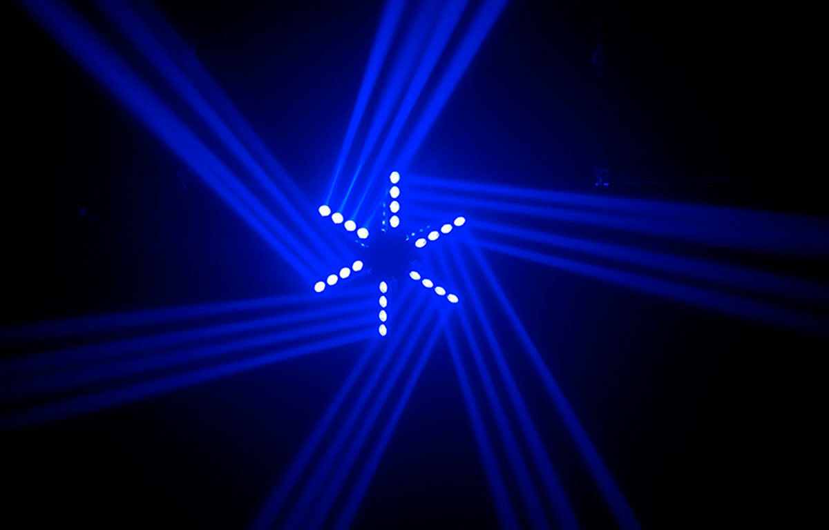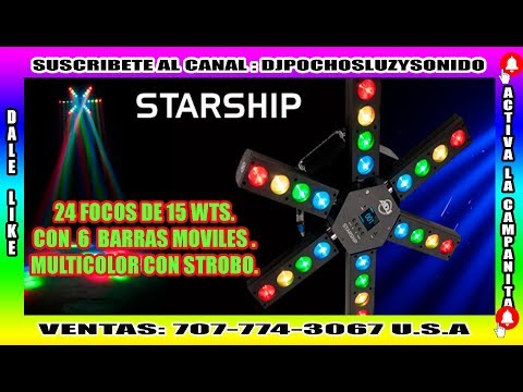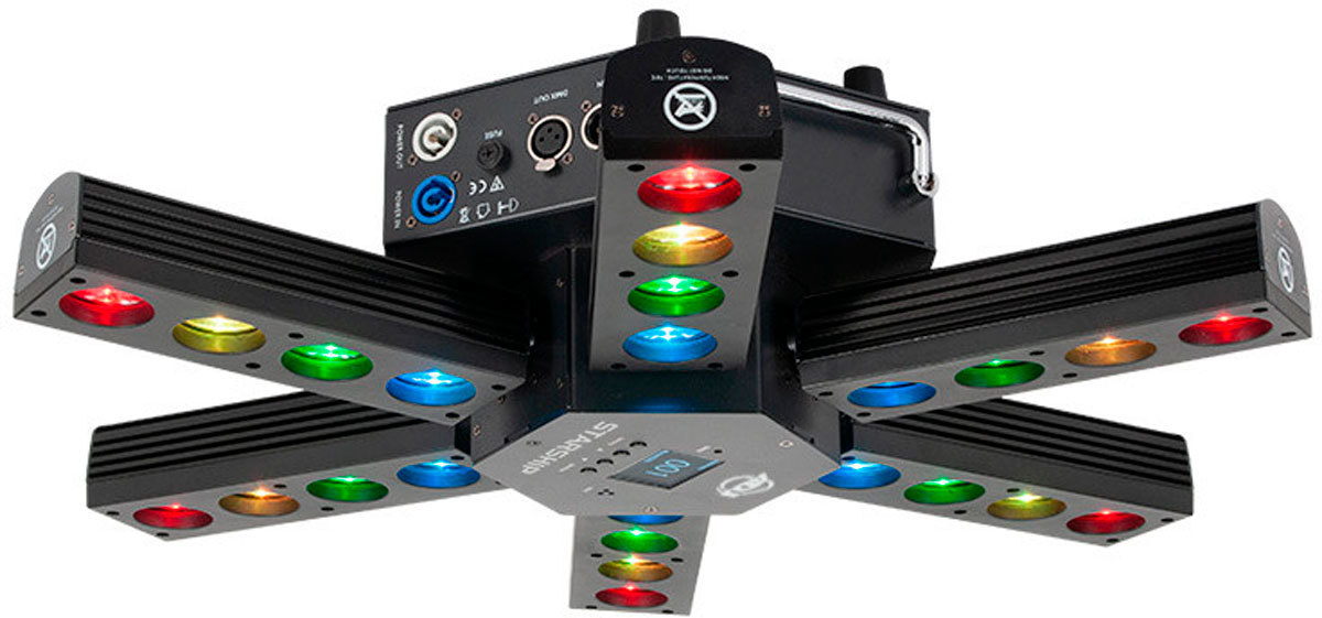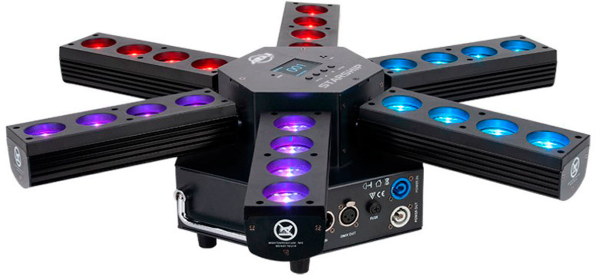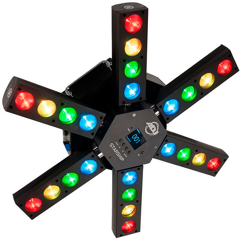 ADJ Starship это современный взгляд на классический центральной эффект, обычно используемый в качестве фокусной точки, установленный в ночном клубе, баре, катке или боулинг-центре. Он имеет шесть рукавов с четырьмя светодиодными элементами на каждый. Каждый рукав отклоняется назад и вперед и производит мощные, острые как бритва лучи от светодиодов RGBW (4-в-1) мощностью по 15 Вт. Каждый светодиод может управляться независимо с помощью различных встроенных программ. Также, пользователь может создавать собственные световые шоу с использованием DMX.