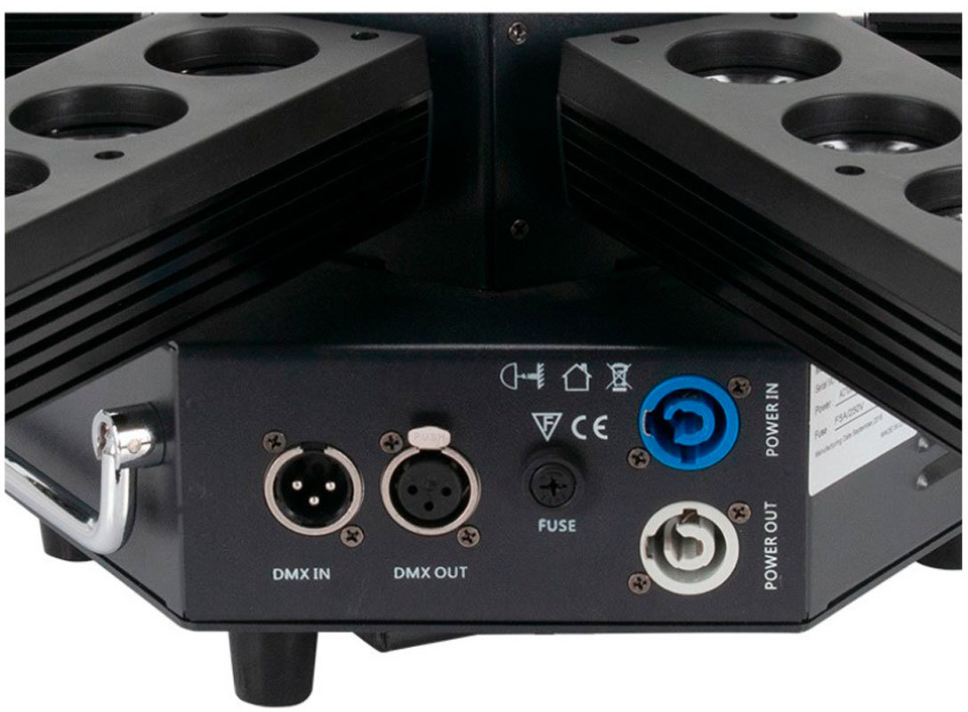 Starship имеет 3-pin DMX In/Out для передачи сигнала данных, а также защитные силовые In/Out для подключения ряда приборов в силовую цепь. Ручка для переноски и резиновые ножки.