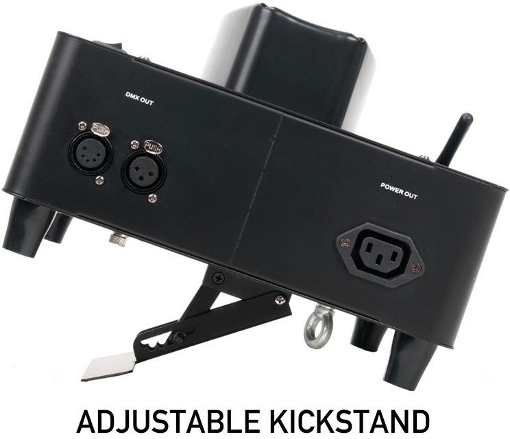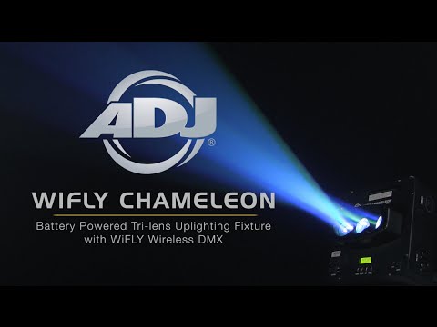 ADJ Wifly Chameleon устройство для омывающего освещения стен имеет три светодиода RGBWA+УФ (6-В-1) мощностью 18 Вт каждый, Угол луча 15°. Вкомплекте встроенная перезаряжаемую литиевая батарея, беспроводной пульт DMX-управления ADJ WiFLY EXR («с расширенным диапазоном») радиусом действия до 2500 футов. Внизу имеется штатив с регулировкой угла в разных положениях. Устройство WiFLY Chameleon имеет 6 режимов DMX-каналов, 6 режимов работы, а также 3- и 5-контактные входы/выходы DMX и IEC для гирляндного подключения питания. Оно совместимо со всеми устройствами и контроллерами ADJ WiFLY. Время работы перезаряжаемой литиевой батареи: 3,5 ч (при полном включении в нормальном режиме) и 5 ч (в энергосберегающем режиме с полным зарядом). Время зарядки батареи: 3 ч (при отключенной нагрузке) . Размеры (ДxШxВ): 260x260x175 мм. Вес 5,1кг