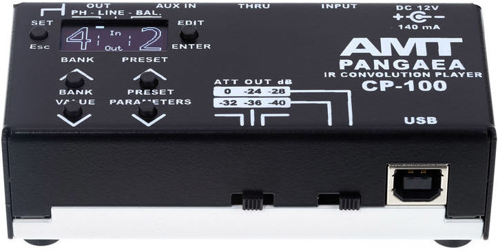 AMT Pangaea CP-100 имеет вход для подключения выхода вашего усилителя, дополнительный вход для подключения mp3-плеера для игры под минус, THRU-выход, к которому вы можете подключить свой кабинет (звук на этом выходе чистый, без наложения импульсной характеристики) и универсальный выход для подключения наушников, микшерного пульта или других устройств (сюда поступает обработанный сигнал). При этом подключение кабинета не обязательно, вы можете играть прямо в линию или наушники. В таких случаях необходимо подключить к выходу вашего усилителя мощности эквивалент нагрузки (например AMT Power Eater PE-120). Дисплей AMT Pangaea CP-100 помимо номера банка и номера пресета показывает уровень входного и выходного сигнала и режим работы выхода эмулятора. Уровень входного сигнала управляется с помощью встроенного аттенюатора.