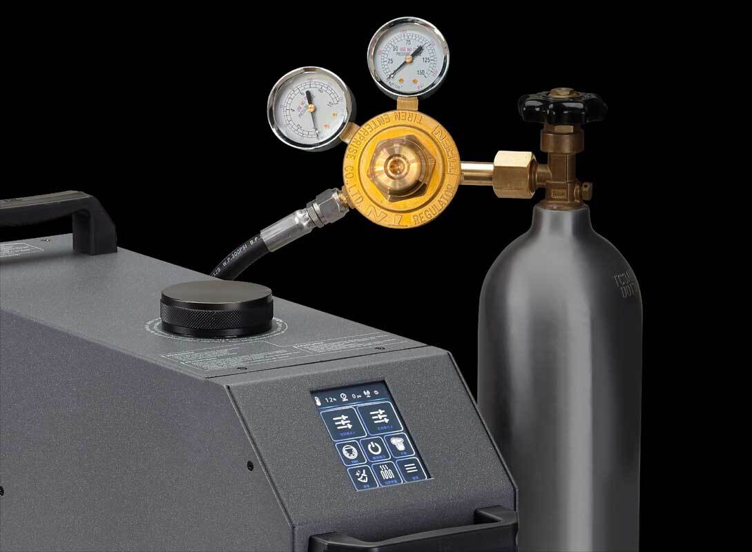 Модель CO2 производит большой объем тонкой дымки плавно и без лишних звуков, оснащена регулируемым вентилятором для подачи дымки под разными углами. Оснащена цветной сенсорной панелью для интуитивно понятного управления, подключается к баллону с газом CO2, смешивая газ и жидкость вместе, что обеспечивает более длительное время зависания.