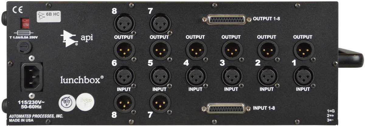 API Audio 6-slot lunchbox - это шасси на 6 слотов, предназначенное для всех стандартных модулей API 5,25" X 1,5". Lunchbox имеет внутренний блок питания с переключателем переменного напряжения на задней панели и съемным шнуром питания. Входные / выходные гнезда XLR. Поставляется с внутренним фантомным источником питания +48 В, подключенным к контакту 15 для интерфейса с микрофонным предусилителем API 512c.
