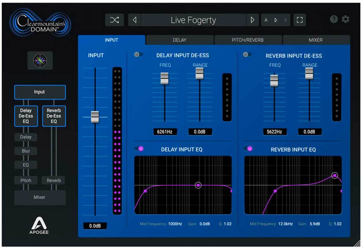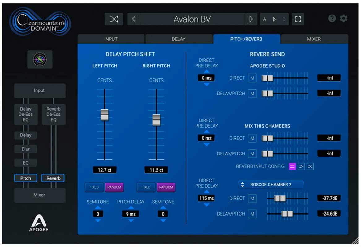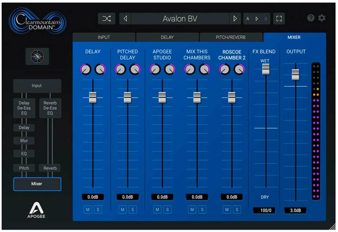 Clearmountain's Domain Pitch and Reverb. Смешайте все вместе. Создайте идеальный микс из пяти FX-процессов - задержки, задержки со сдвигом высоты тона и трех персональных сверточных ревербераторов Боба, а затем настройте смешение между сухим и мокрым сигналом.