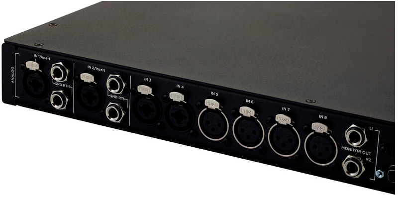 - Передняя панель с усилителями наделена двумя гитарными входами, которые работают в классе A. Для реампинга есть пара двухрежимных выходов.