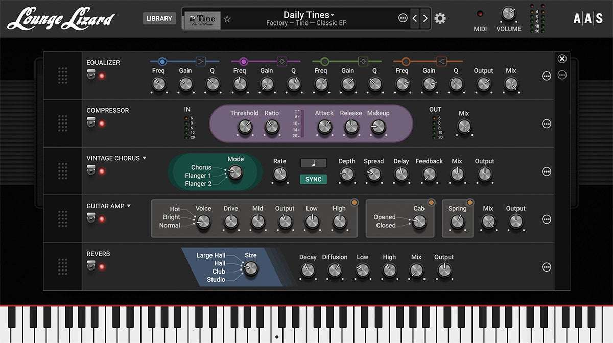 На сцене или в студии Lounge Lizard EP-5 обеспечивает выразительный звук винтажных электропианино — в красивой упаковке со всеми инструментами, необходимыми для формирования, игры и исполнения.