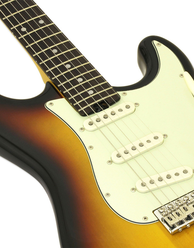 Звукоснимателями установлены три сингла: Alnico V, создающие чистое органичное звучание. Темброблок включает в себя регулятор громкости, два регулятора тона, пятипозиционный переключатель звукоснимателей. Синхронизированный тремоло бридж представлен в винтажном стиле, фурнитура хромированная. Гитары STG-62 доступны в трех цветовых вариациях - 3TS (3 Tone Sunburst), BK (Black) и VW (Vintage White).