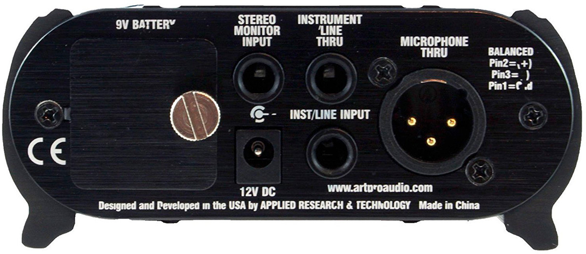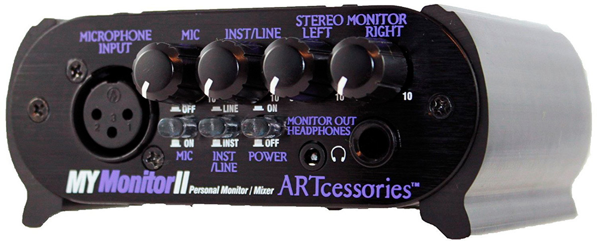ART Mymonitor II — Персональный мониторный микшер, monitor input, instrument/line in, mic thru, stereo monitor input, выходы на наушники TRS 1/4 и 1/8, питание от блока питания 12 В или одной батареи 9 В.