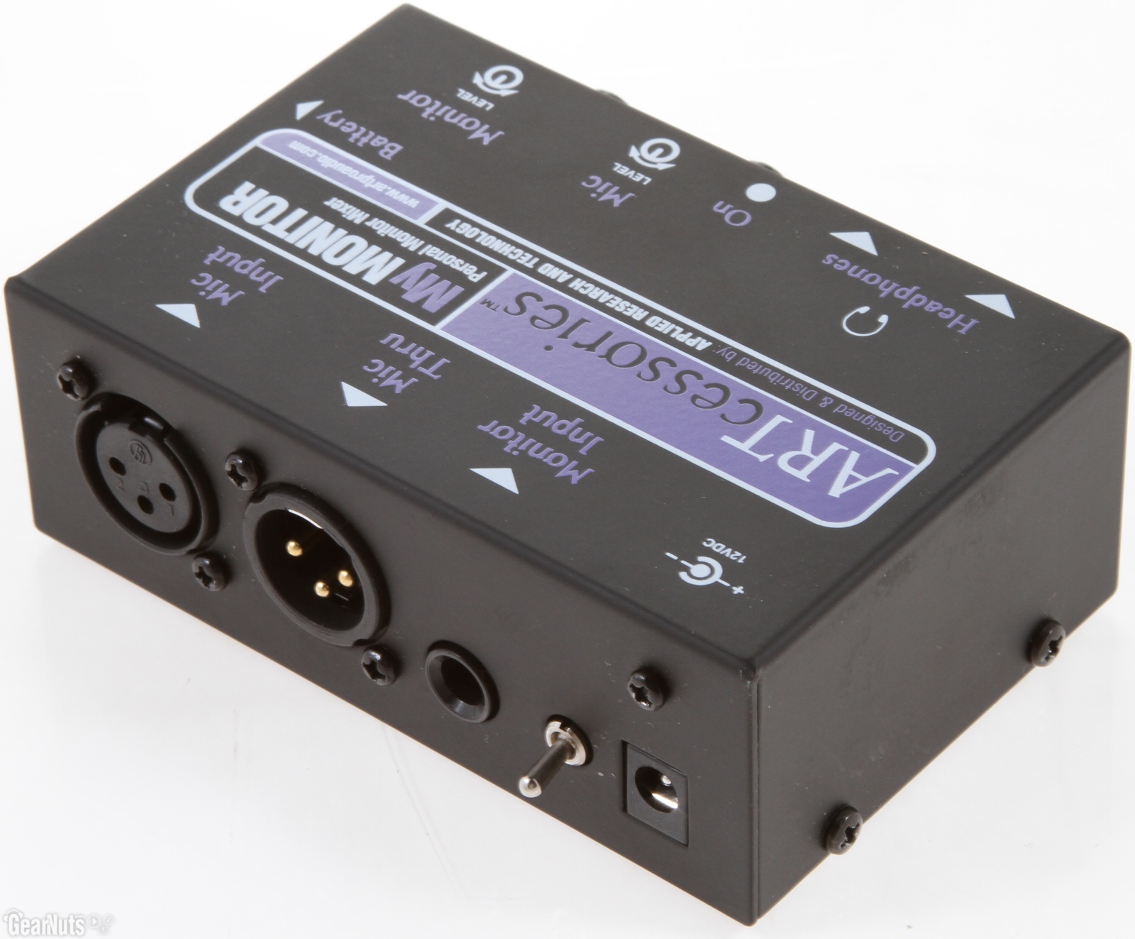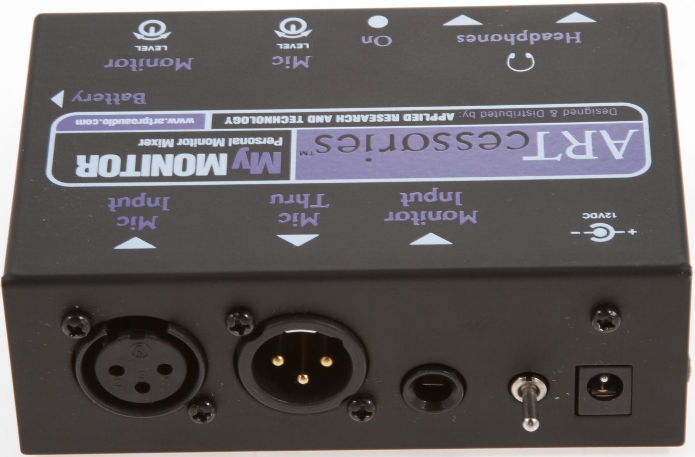 Уровни микрофонов и линейных мониторов могут быть настроены для микса и звука через наушники. Только микрофонный сигнал пойдет на панель. А так как Mymonitor может питаться переменным током или батарейкой, то его можно использовать на больших сценах и в любом месте, где рядом нет источника переменного тока. Динамические и конденсаторные микрофоны также могут использоваться, поскольку фантомная мощность из микшера или другого источника будет проходить через джек Mic Thru.