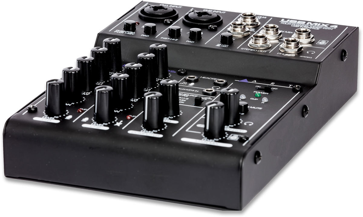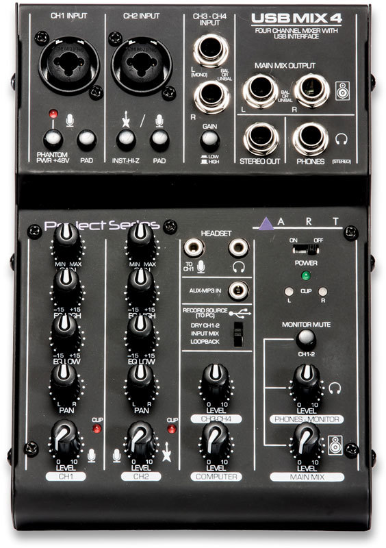 ART USBMix4 - компактный 4-канальный микшер с USB, который может быть использован в качестве внешнего аудиоинтерфейса. Имеет два комбинированных микрофонных/линейных входа и два инструментальных моно-входа, два основных выхода, стереовыход и выход для наушников. Оснащен переключаемым источником фантомного питания + 48 В, независимыми регуляторами уровня для основного выхода и наушников.