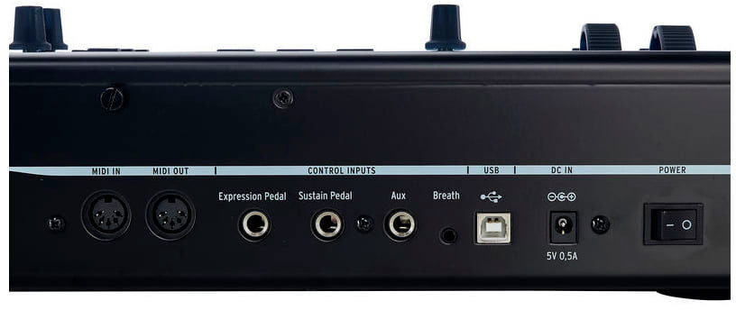 - TRS-разъёмы для педалей экспрессии, сустейна и вспомогательной педали;