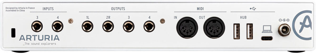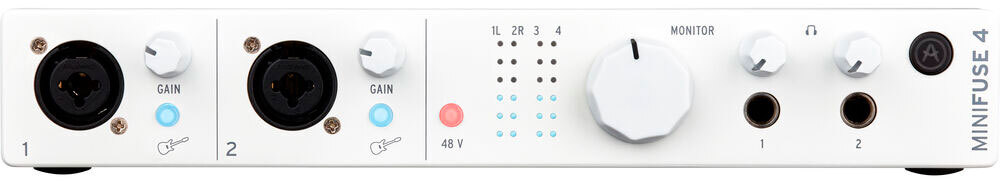 Arturia MiniFuse 4 White 4 x 4 USB-аудиоинтерфейс, два комбинированных входа XLR-1/4” (микрофонный / линейный / инструментальный уровень) с фантомным питанием +48 В, два входа 6,3 Jack, 4 выхода 6,3 Jack, 2 выхода для наушников, MIDI In/Out, 2x USB Hub