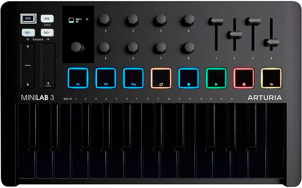 От приятной на ощупь клавиатуры до интеллектуальных пэдов и фейдеров, интегрированных в DAW, и мини-дисплея, работающего в режиме реального времени, - каждый аспект гибридного клавиатурного контроллера MiniLab 3 разработан так, чтобы быть интуитивно понятным, выразительным и доставлять удовольствие от использования как новичкам, так и профессионалам. Встроенный арпеджиатор, режим Chord, пользовательские пресеты DAW и удобная транспозиция помогут вам в творческом процессе. Создание музыки еще никогда не было таким доступным.