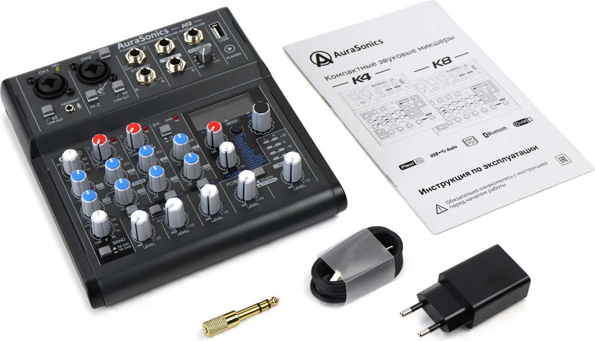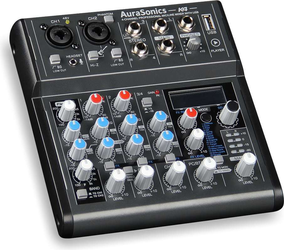 AuraSonics K4 компактный микшерный пульт 2 мик.+1 лин.стерео+FXстерео+дополнительный стереоканал со встроенных источников Bluetooth/PC-Audio/USB-плеер, параметрический эквалайзер FlexiEQ