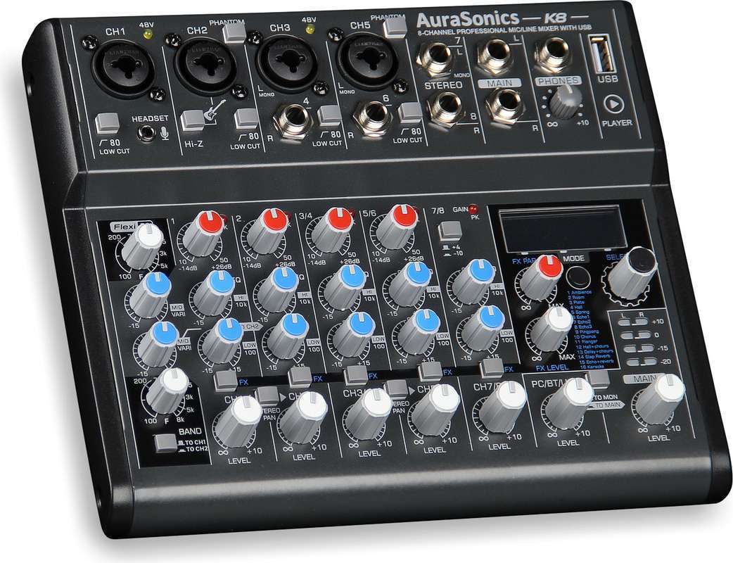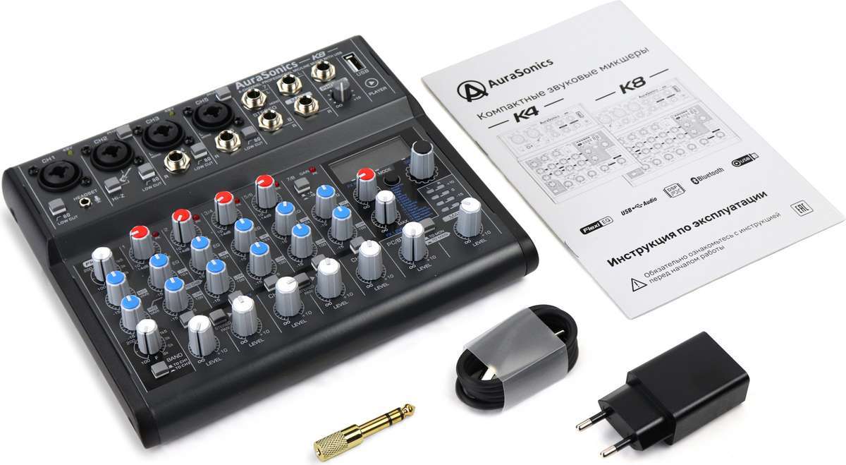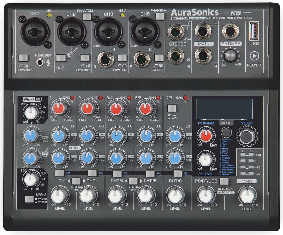 AuraSonics K8 компактный микшерный пульт 2 мик.+2 мик.моно/линейных стерео+1 лин.стерео+FXстерео+дополнительный стереоканал со встроенных источников Bluetuuth/PC-Audio/USB-плеер, параметрический эквалайзер FlexiEQ