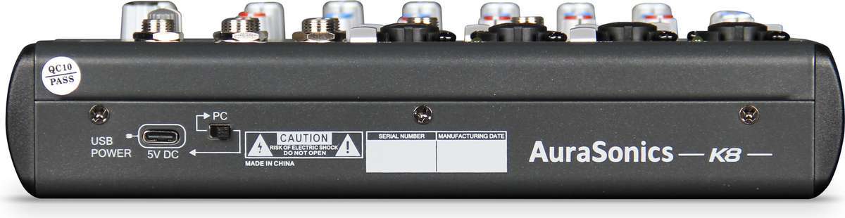 Микшеры К4 и К8 используют для питания стандартный сетевой адаптер 5В через кабель USB-A - USB-C. Также возможно питание микшера от USB- разъёма компьютера, при этом переключатель на задней панели определяет что микшер получает только питание DC или работает как аудио-интерфейс PC.