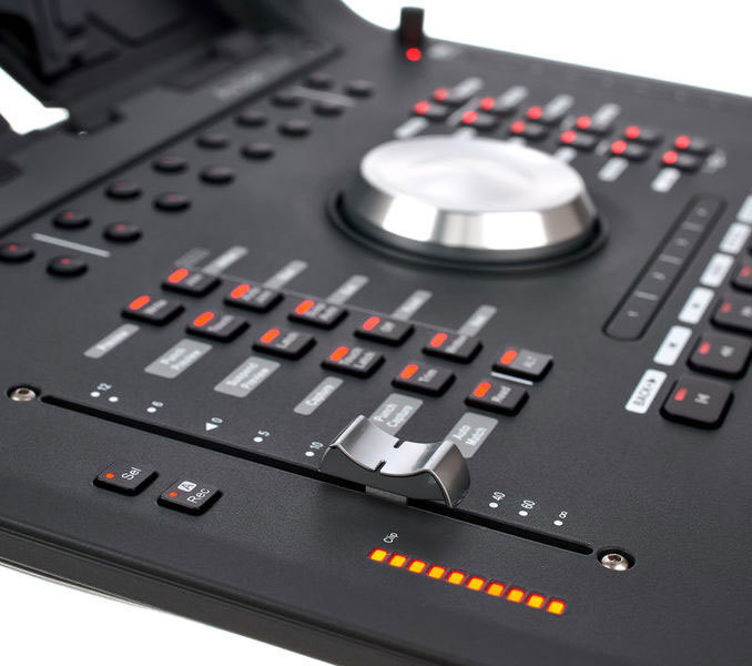 Получите быстрый доступ к каждому каналу в режиме отображения Tracks или Universe — не имеет значения, насколько большой получилась ваша сессия. Держите под рукой все опции транспорта, переключаясь кнопкой Shift в другую раскладку для доступа к таким функциям, как установка меток in и out, или переключатель режимов pre/post-roll. Используйте назначаемое программное колесо и кнопки справа от него для переключения режимов jog/shuttle, выполнения зуммирования, выбора банков, переключения рабочих станций и прочих функций. Перемещайтесь по проекту при помощи двух программируемых сенсорных линеек, которые можно использовать также для выполнения прочих задач.
