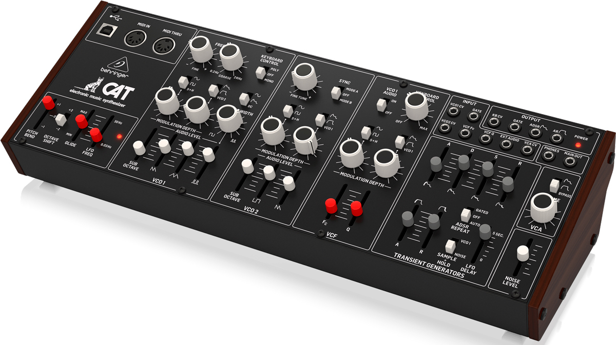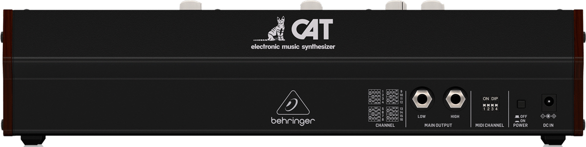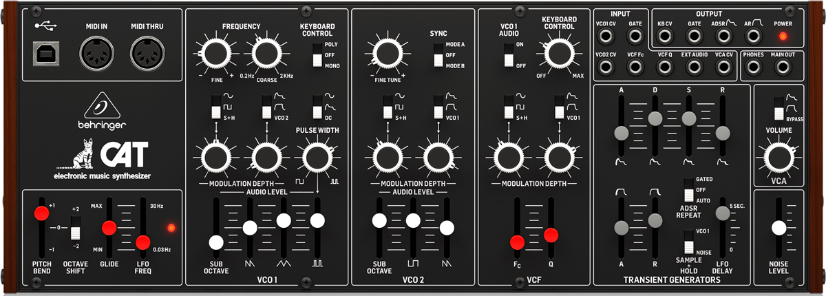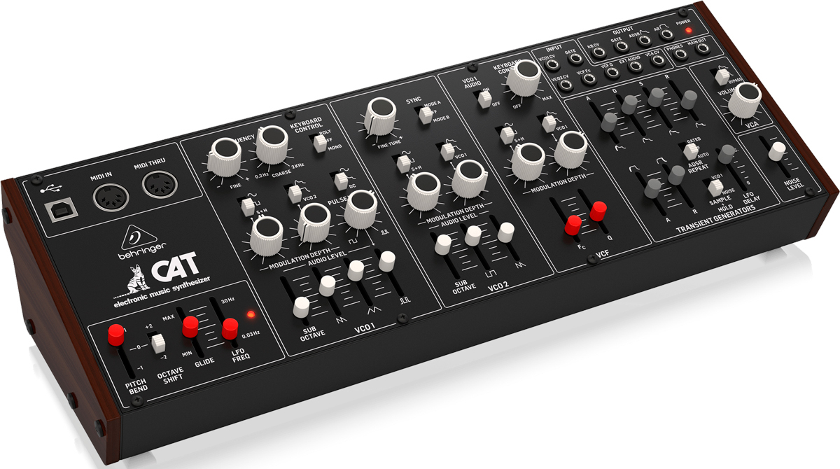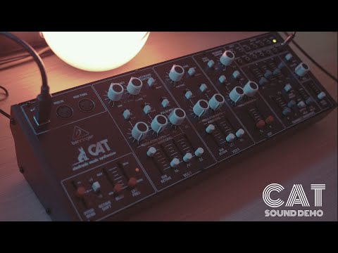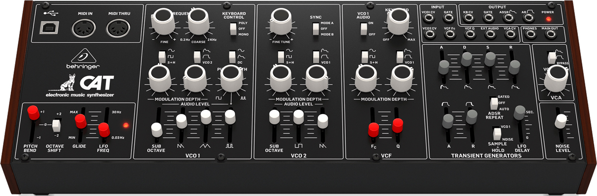 Behringer CAT Synth - ремейк аналогового синтезатора CAT SRM II, но без клавиатуры. Синтезатор оснащен двумя генераторами VCO, первый из которых предлагает 4 смешиваемых формы волны (пилообразную, треугольную, модулированную синусоиду и суб-октавную прямоугольную), а второй имеет пилообразную, прямоугольную и суб-октавную. Для каждого генератора предусмотрен микшер со слайдерами форм волны, что позволяет, смешивая их, настроить желаемый звук. Осцилляторы снабжены двумя аттенюаторами глубины модуляции и могут модулироваться шестью различными источниками.