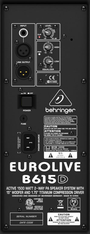 BEHRINGER B615D - активная акустическая система, пиковая мощность 1500 вт, двухполосная -15 +1, 75, диапазон частот 50-18000 Гц, звуковое давление 126 Дб, вес 26, 2 кг!