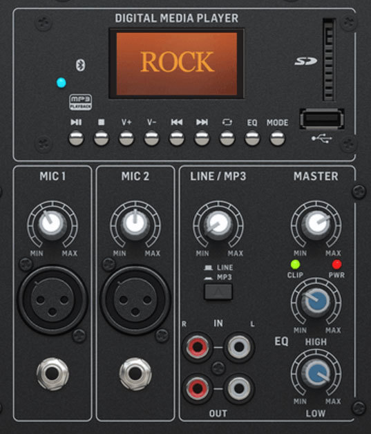 Система оснащена 800-ваттным усилителем класса AB, высококачественным MP3-плеером с Bluetooth-ресивером, USB-портом и слотом для SD/MMC карт, а также трехканальным микшером с двумя микрофонными входами. Удобный линейный выход позволяет подключать дополнительные пассивные системы PK115. Стриминг с помощью Bluetooth открывает доступ к практически неограниченному количеству доступного в интернете контента, включая радиоканалы.