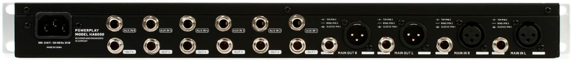 На задней панели расположен дополнительный выход 1/4" для каждого канала, с возможностью подключения до 12 пар наушников для одновременного прослушивания 6 индивидуальных миксов. На задней панели также имеются стерео 1/4" входы и выходы XLR для подключения нескольких устройств HA6000, обеспечивая еще большую мощность при прослушивании. Между тем, малошумный, функциональный усилитель HA6000 обеспечивает максимальную производительность в прочном, аудиофильском исполнении.