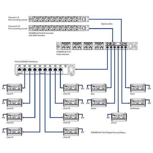 Базовая система включает в себя один аудио-интерфейс BEHRINGER P16-I, который подключается к главному микшерному пульту, и до шести персональных микшеров P16-M, в результате чего получается достаточно большая система для оснащения типовой студии звукозаписи, ансамбля малого или среднего размера, или группы прославления в церкви. Вам так же потребуются несколько стандартных аудио-кабелей и кабели CAT5. Опциональный монтажный кронштейн P16-MB позволяет установить цифровой персональный микшер P16-M на любой стандартный микрофонный, музыкальный или барабанный штатив. Систему можно легко расширить при помощи устройств P16-D – цифровых распределителей сигналов по сети ULTRANET. Шесть таких устройств можно подключить в единую сеть для управления сорока восемью персональными микшерами P16-M.