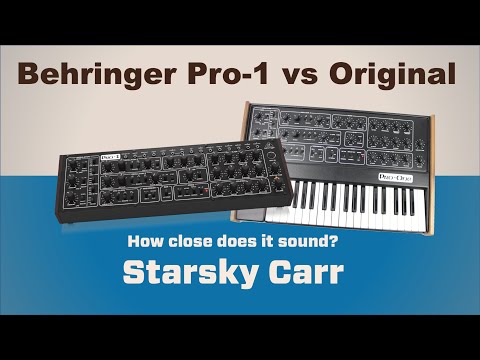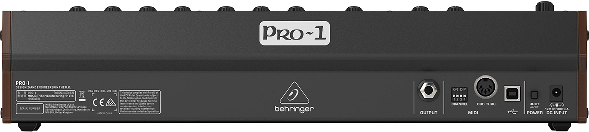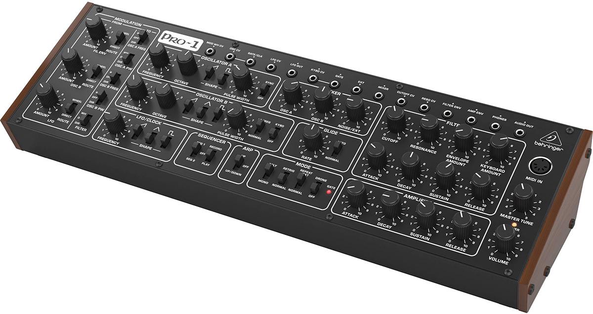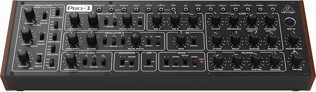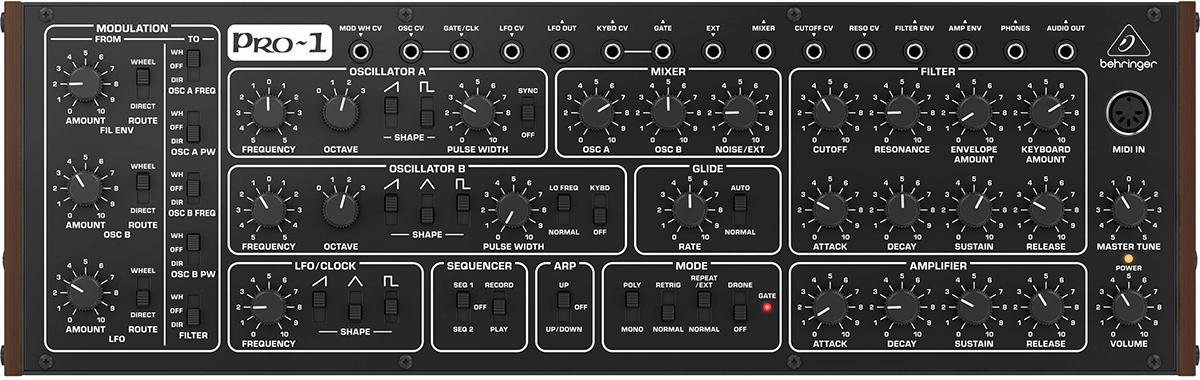 Behringer Pro-1 — доступное перееиздание классического монофонического синтезатора Sequential Pro One 1981 года. Схемотехника осталась практически баз изменений, за исключением двух дополнительных CV-разъемов и поддержки USB.